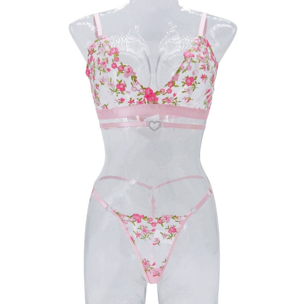 Get ready to bloom in this Floral Embroidery Tri Top Set! This unique triangle top and matching thong combo is perfect for those who want to add a touch of fun to their lingerie collection. The delicate floral embroidery adds a flirty touch to this playful set.